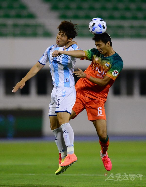 16일 강릉종합운동장에서 열린 프로축구 ‘하나원큐 K리그1 2020’ 2위 울산현대와 3위 강원FC 경기에서 울산 이동경과 강원 조지훈이 공중볼을 다투고고 있다.