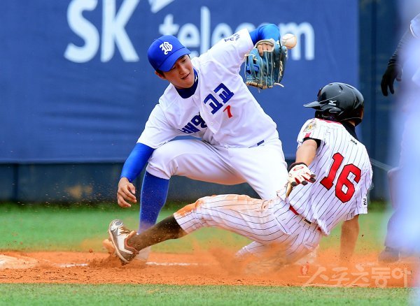 17일 서울 목동야구장에서 ‘제 74회 황금사자기 전국고교야구대회 겸 주말리그 왕중왕전’ 김해고등학교와 서울 배명고등학교의 16강 경기가 열렸다. 8회초 1사 1루에서 김해고 황민서 타석 때 1루 주자 최재영이 2루 도루에 성공한 뒤 상대 실책으로 3루까지 진루하고 있다.