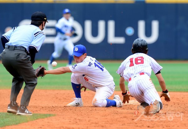 17일 서울 목동야구장에서 ‘제 74회 황금사자기 전국고교야구대회 겸 주말리그 왕중왕전’ 김해고등학교와 서울 배명고등학교의 16강 경기가 열렸다. 8회초 1사 1루에서 김해고 황민서 타석 때 1루 주자 최재영이 2루 도루에 성공하고 있다.