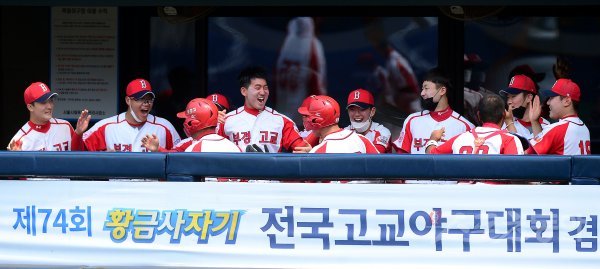 17일 서울 목동야구장에서 ‘제 74회 황금사자기 전국고교야구대회 겸 주말리그 왕중왕전’ 부산 부경고등학교와 춘천 강원고등학교의 16강 경기가 열렸다. 7회초 2사 만루에서 부경고 윤은빈의 2타점 적시타 때 득점에 성공한 선수들이 동료들의 환영을 받고 있다.