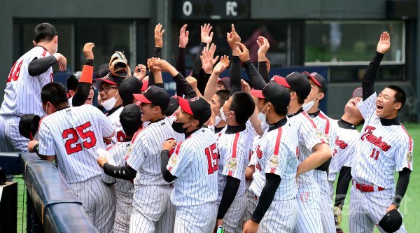 17일 서울 목동야구장에서 ‘제74회 황금사자기 전국고교야구대회 겸 주말리그 왕중왕전‘ 김해고와 배명고의 16강 경기가 열렸다. 김해고가 배명고에 4-3으로 승리한 뒤 선수들이 그라운드에서 기쁨을 나누고 있다. 목동 | 김민성 기자 marineboy@donga.com