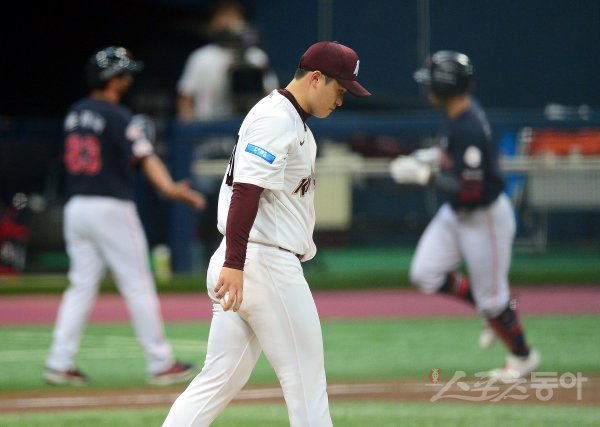 선발 투수로 등판한 키움 최원태가 3회초 1사 3루 롯데 전준우에게 좌월 투런 홈런을 허용한 후 고개를 떨구고 있다.