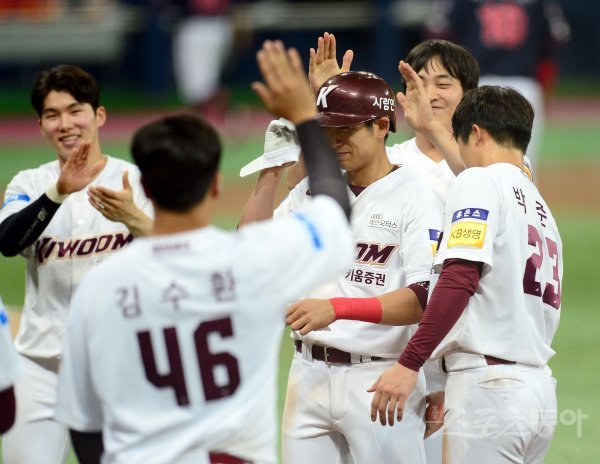 9회말 1사 1,2루 키움 이정후가 끝내기 안타를 치고 팀 동료들의 축하를 받고 있다.