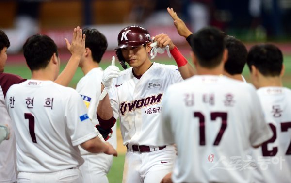 9회말 1사 1,2루 키움 이정후가 끝내기 안타를 치고 팀 동료들의 축하를 받고 있다.