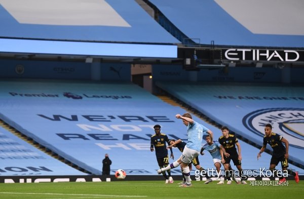 맨시티와 아스날은 18일 오전 4시 15분(이하 한국시각) 영국 맨체스터에 위치한 에티하드 스타디움에서 2019-20 EPL 29라운드 경기에 나섰다. 코로나19 여파로 약 3개월간 중단 됐던 EPL은 애스턴 빌라와 셰필드 유나이티드의 경기를 시작으로 재개됐다.