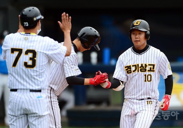18일 서울 목동야구장에서 ‘제74회 황금사자기 전국고교야구대회 겸 주말리그 왕중왕전’ 강릉고등학교와 경기상업고등학교의 8강 경기가 열렸다. 4회초 1사 경기상고 7번타자 박성재가 우월 솔로 홈런을 날린 뒤 황준서의 축하를 받고 있다.