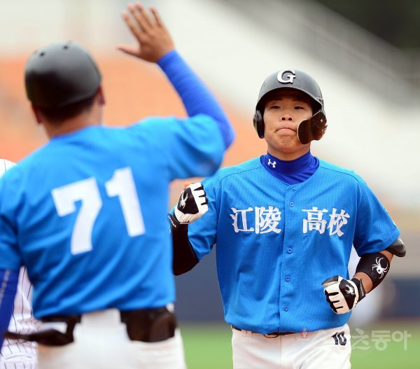 18일 서울 목동야구장에서 ‘제74회 황금사자기 전국고교야구대회 겸 주말리그 왕중왕전’ 강릉고등학교와 경기상업고등학교의 8강 경기가 열렸다. 1회말 1사 3루 강릉고 5번타자 김선우가 1타점 좌중간 적시타를 날린 뒤 기뻐하고 있다.