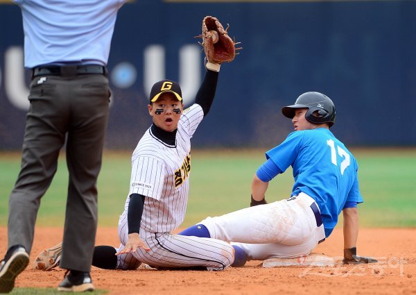 18일 서울 목동야구장에서 ‘제74회 황금사자기 전국고교야구대회 겸 주말리그 왕중왕전’ 강릉고등학교와 경기상업고등학교의 8강 경기가 열렸다. 4회말 무사 2루 강릉고 1번타자 정준재의 타석 때 경기상고 유격수 유준서가 2루주자 허인재를 태그 했지만 세이프 되고 있다.