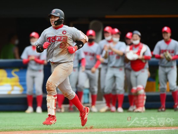 7회말 2사 1루 대전고 4번타자 김성용이 좌월 2점 홈런을 날린 뒤 그라운드를 돌며 밝게 웃고 있다.