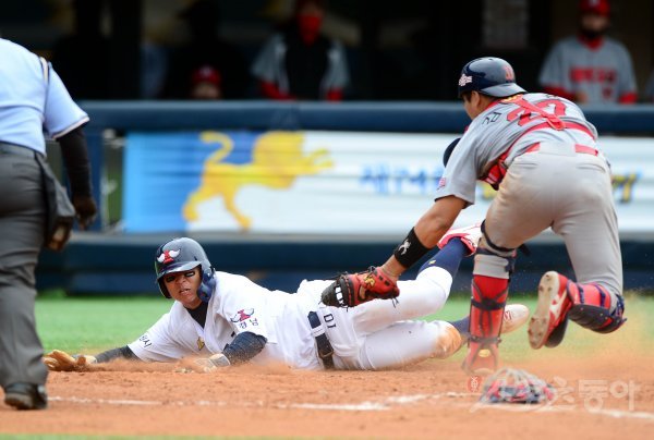 3회초 2사 2루 마산고 4번타자 최현욱의 좌중간 안타 때 2루주자 김도영이 홈으로 파고들었지만 대전고 포수 김성용에게 태그 아웃되고 있다.