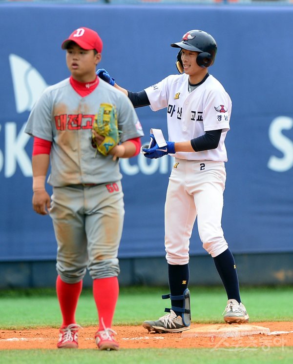 3회초 1사 1루 마산고 1번타자 조현진이 1타점 좌전 3루타를 날린 뒤 기뻐하고 있다.