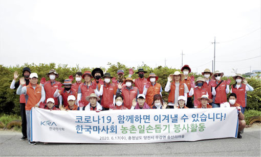 한국마사회(회장 김낙순) 임직원과 스포츠단 40여 명으로 구성된 엔젤스 봉사단은 17일 충청남도 당진시 우강면 송산리의 농가를 찾아 콩 심기 작업을 돕는 농촌 일손 돕기 봉사활동(사진)을 펼쳤다. 정부에서 발표한 신종 코로나바이러스 감염증(코로나19) 국민 행동 지침 가이드라인에 따라 일손 돕기 준수사항을 마련하고 관련 내용을 사전에 교육한 이후에 콩 심기 활동이 진행됐다. 작업 간 일정한 거리를 두고 봉사활동이 이뤄졌으며 지역 주민들과의 접촉도 최소화하는 방향으로 운영됐다. 이번 봉사활동은 5월 마사회 장학관에 입주한 대학생들을 대상으로 농번기 일손 돕기를 희망하는 지역의 신청을 받아 진행됐다. 활동 시기와 필요 인력 등을 고려해 행선지를 충남 당진으로 최종 결정했다. 마사회는 3월부터 경기도 포천, 제주 서귀포, 경기도 광명 등에 총 5회, 100여 명의 인력을 투입해 농촌 일손 돕기 봉사활동을 진행하며 농가에 힘을 보탰다.