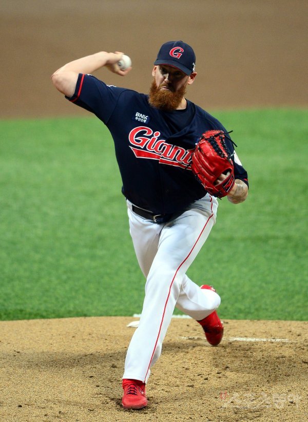 1회말 롯데 스트레일리가 마운드에 올라 역투하고 있다.