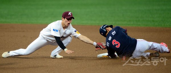 6회초 2사 1루 롯데 손아섭의 타석 때 1루주자 민병헌이 2루로 도루를 시도해 세이프되고 있다.