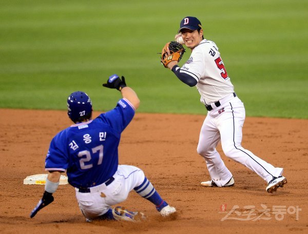 2회초 1사 1루 삼성 내야 땅볼 때 두산 김재호가 1루주자를 포스 아웃시킨 후 1루로 송구하고 있다.