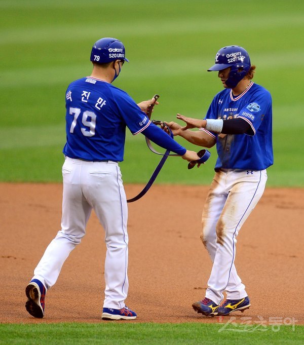 1회초 1사 1루 상황에서 1루주자 삼성 김상수가 2루 슬라이딩 도루하다 벨트가 끊어져 교체받고 있다.
