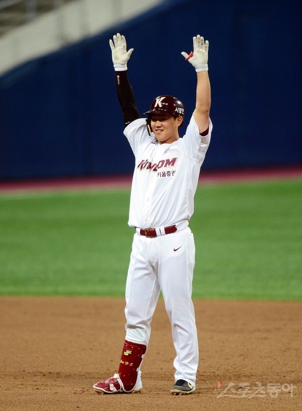 연장 10회말 1사 1루 키움 대타 주효상이 1타점 끝내기 2루타를 날린 뒤 세리머니를 하고 있다.