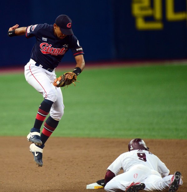 8회말 1사 1루 키움 김규민의 타석 때 롯데 유격수 마차도가 1루주자 박정음의 2루 도루를 허용하고 있다.