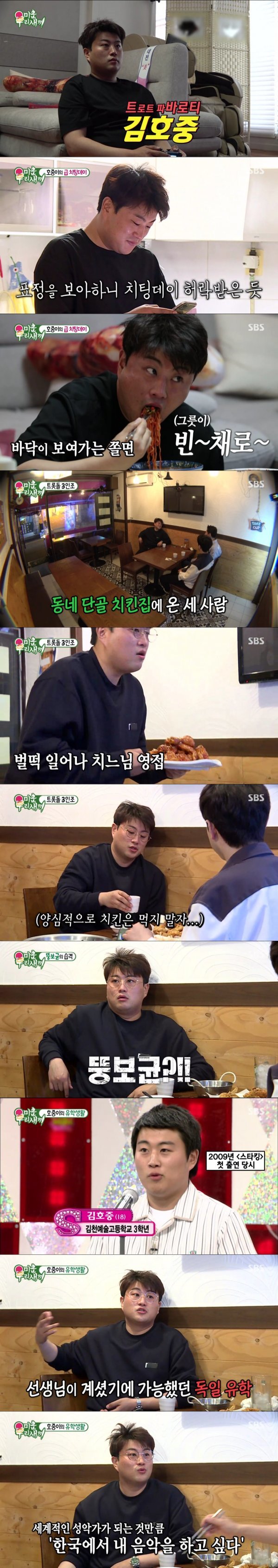 하지만 다이어트 중인 호중은 “양심적으로 치킨은 못 먹는다”며 치킨무와 강냉이만 흡입했다. 이때 형들은 "치킨 무 하나당 15칼로리다"라며 “치킨 무 10개 먹으면 150칼로리, 160칼로리인 밥 한 공기와 다를바 없다”고 말해줬다. 김호중은 "그럼, 차라리 밥을 시키자"며 "맨날 치킨 시키면 치킨 무 두 개씩 먹었는데, 살찌는 이유가 있었다"며 당혹감을 금치 못했다.