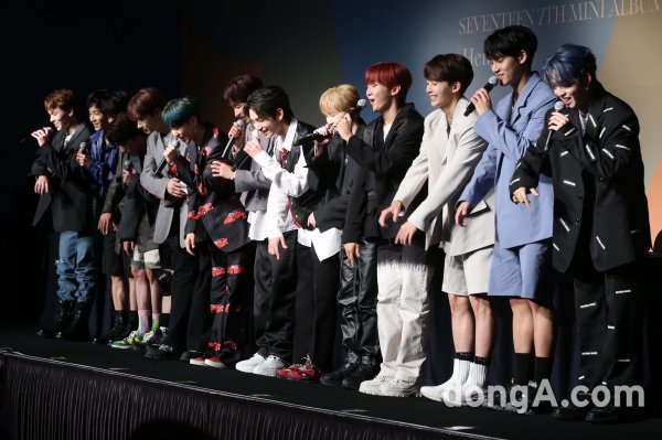 그룹 세븐틴이 22일 오후 서울 강남구 인터컨티넬탈 코엑스에서 열린 미니 7집 \'헹가래\' 기자간담회를 마치고 취재진에게 인사를 하고 있다.