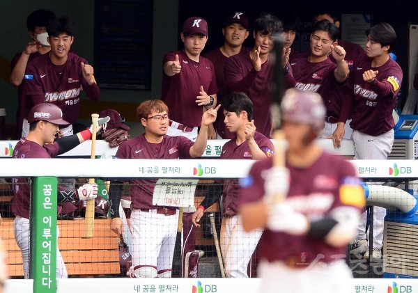 4회초 2사 1, 2루 키움 서건창의 적시타 때 2루주자 전병우가 득점에 성공한 뒤 더그아웃에서 동료들의 축하를 받고 있다.