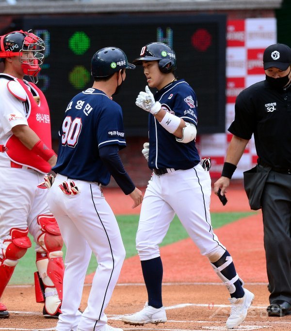 6회초 1사 1루에서 두산 허경민이 투런 홈런을 쏘아 올린 뒤 고영민 코치의 환영을 받고 있다.