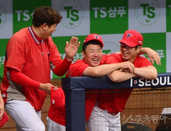 28일 서울 고척스카이돔에서 ‘2020 신한은행 SOL KBO리그’ 키움 히어로즈와 KIA 타이거즈의 경기가 열렸다. KIA 최희섭, 진갑용, 김종국 코치가 훈련에 앞서 더그아웃에서 밝게 웃고 있다.