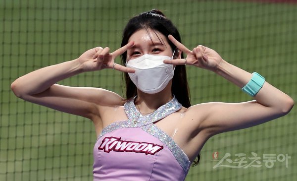 키움 치어리더가 응원 단상에서 공연을 펼치고 있다.