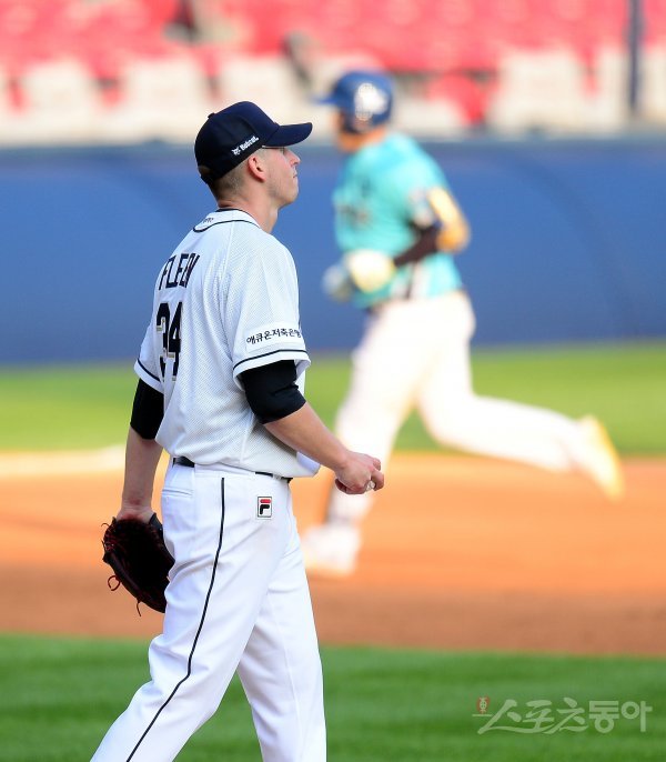 두산 선발 투수 플렉센이 5회초 1사 1,3루 NC 권희동에게 좌월 스리런 홈런을 허용한 후 외야를 바라보고 있다.