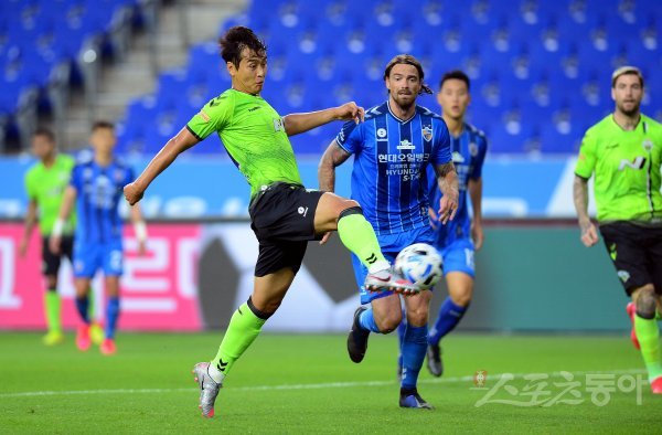 28일 울산 문수월드컵경기장에서 열린 ‘하나원큐 K리그1 2020’ 울산 현대와 전북현대의 경기에서 전북 이동국이 슛을 날리고 있다.