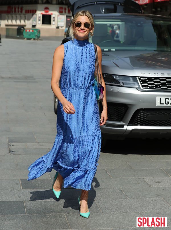 26일(현지시간) 영국 런던의 스튜디오 앞에서 애슐리 로버츠는 색다른 패턴의 파란 드레스를 입고 에메랄드 색의 구두를 매치하여 여름철 사람들의 눈을 시원하게 만들었다.