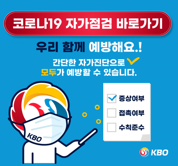 KBO(총재 정운찬)가 리그 관계자 전원을 대상으로 ‘코로나19 일별 온라인 자가 점검’을 실시한다.