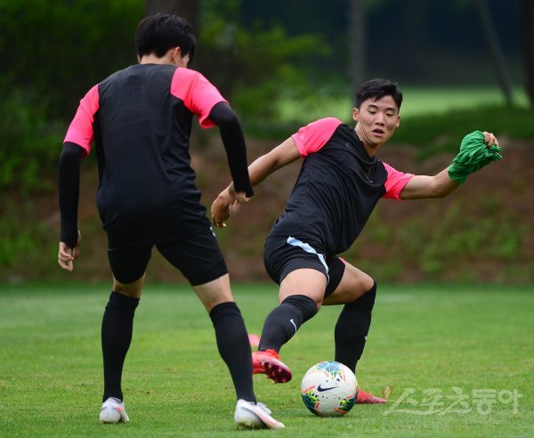 홍시후가 동료들과 볼 뺏기 훈련을 하고 있다.