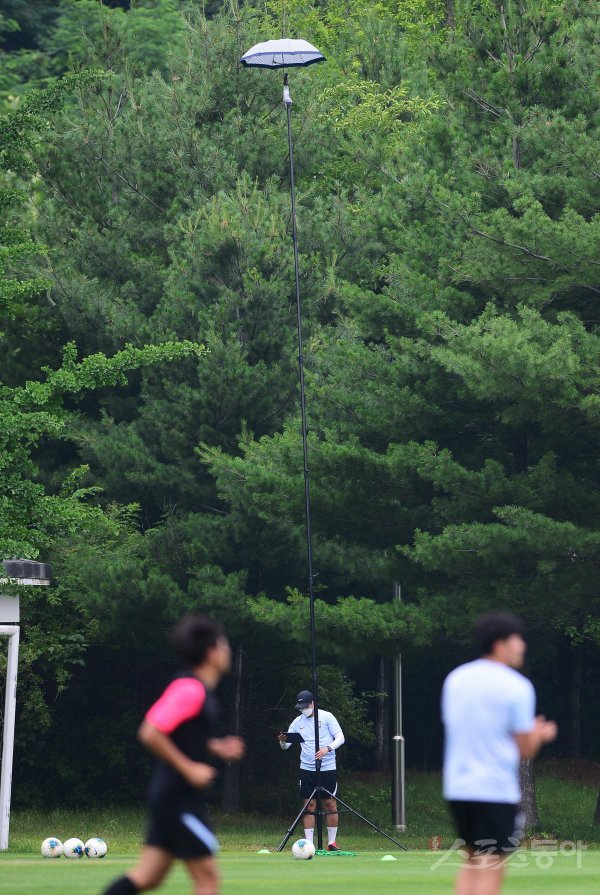 코치진이 선수들의 훈련을 지켜보기 위해 장대 위에 카메라를 설치하고 있다.