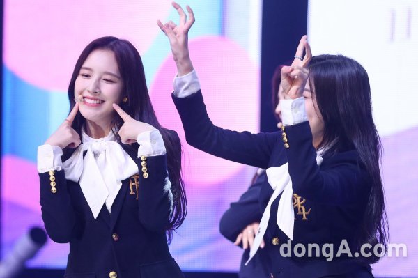 그룹 위클리의 이재희(왼쪽)가 30일 오후 서울 마포구 메세나폴리스 신한카드 판스퀘어에서 열린 첫 번째 미니앨범 \'위 아(We are)\' 발매 미디어 쇼케이스에서 새로운 무대를 선보이고 있다.