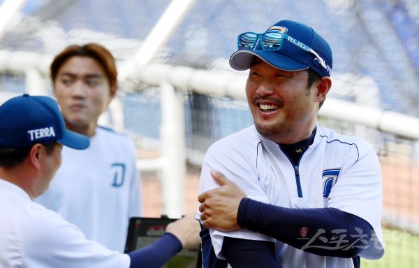경기 전 NC 이호준 코치가 환한 미소를 짓고 있다.