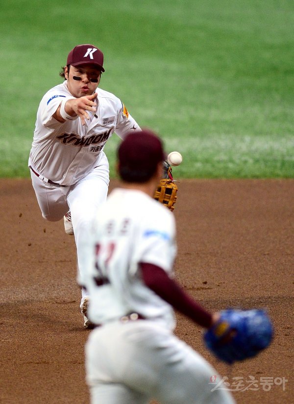 2회초 키움 박병호가 내야 땅볼 투수에게 토스하고 있다.