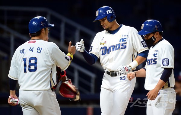 6회말 1사 1루에서 NC 알테어가 역전 투런 홈런을 쏘아 올린 뒤 박석민의 환영을 받고 있다.