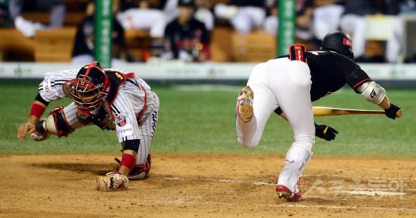 5회초 2사 1, 3루 kt 김민혁이 이민호의 폭투를 피하고 있다.