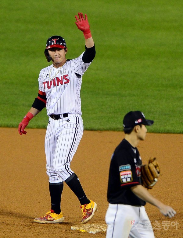 7회말 1사 2루 LG 오지환이 1타점 우전 2루타를 날린 뒤 기뻐하고 있다.
