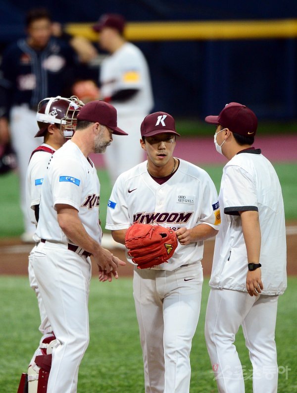 3회초 1사 만루 상황에서 키움 문성현이 마운드를 내려가고 있다.