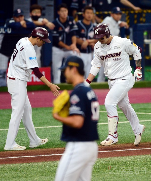 4회말 1사 1, 2루 키움 박병호가 좌월 3점 홈런을 날린 뒤 그라운드를 돌며 3루코치와 기쁨을 나누고 있다.