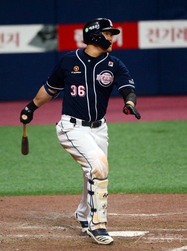 5회초 2사 1루 두산 오재일이 우전 안타를 날리고 있다.