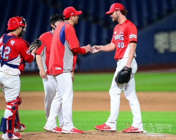 3일 창원 NC파크에서 ‘2020 신한은행 SOL KBO리그’ NC 다이노스와 KIA 타이거즈의 경기가 열렸다. 7회말 1사 3루에서 NC 김태군에게 적시타를 허용한 KIA 선발 가뇽이 교체되고 있다. 창원 | 김민성 기자 marineboy@donga.com