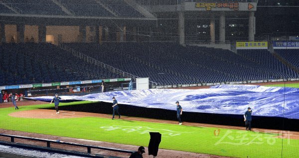 3일 창원 NC파크에서 ‘2020 신한은행 SOL KBO리그’ NC 다이노스와 KIA 타이거즈의 경기가 열렸다. 비가 내리는 가운데 경기 종료 후 NC 관계자들이 대형 방수포를 설치하고 있다. 창원 | 김민성 기자 marineboy@donga.com