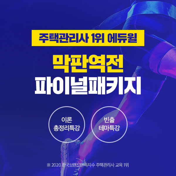 2020 한국브랜드만족지수 주택관리사 교육 1위 에듀윌의 업계 최고 교수진을 비롯해 온라인 서점 YES24 주택관리사 부문 61개월 연속 베스트셀러 1위를 차지하고 있는 에듀윌 주택관리사 수험서와 2년 연속 최고득점 합격생을 배출한 에듀윌이 2020 주택관리사 1차 시험 대비 만든 ‘막판 역전 파이널 패키지’에 대한 보다 자세한 사항과 수강 신청은 에듀윌 주택관리사 홈페이지에서 확인 가능하다.