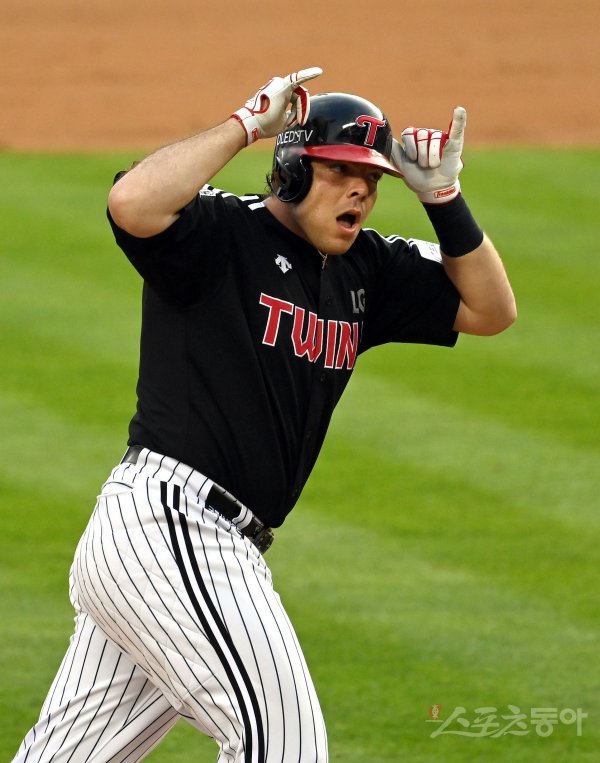 4회초 무사 LG 라모스가 동점 좌중월 솔로 홈런을 날리고 그라운드를 돌며 세리머니를 하고 있다.