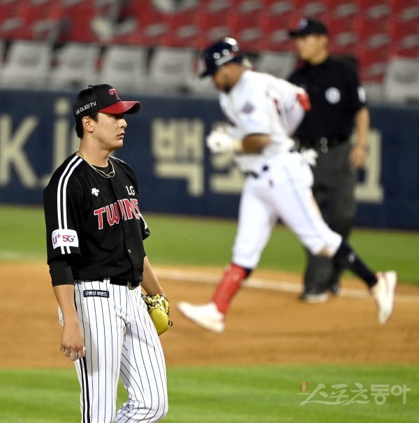 LG 최동환이 6회말 1사 두산 페르난데스에게 우월 솔로 홈런을 허용하고 있다.
