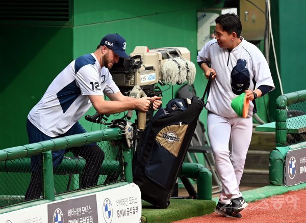 경기 전 NC 라이트가 훈련 스태프의 가방을 들어주고 있다.