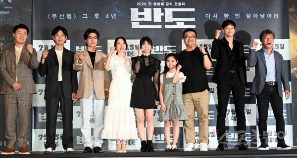 배우 김민재, 김도윤, 구교환, 이정현, 이레, 이예원, 연상호 감독, 강동원, 권해효가 9일 서울 용산구 CGV 용산아이파크몰에서 열린 영화 ‘반도’ 언론 배급 시사회에 참석해 포토타임을 갖고 있다.